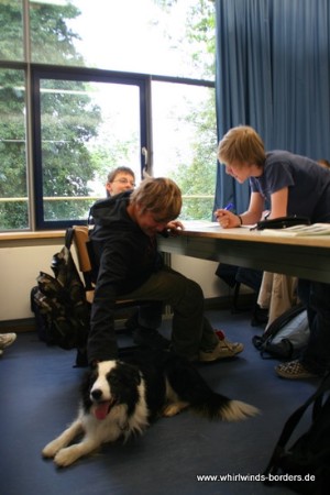 Die Borderbande kriegt i.d.R. die Türen aufgehalten (freut mich besonders, wenn ich Unterrichts- und Demomaterial durch die Schule transportieren muss :-)), man hat ein Lächeln für sie, Kinder und Erwachsene sprechen sie an, streicheln sie, manche versinken regelrecht im Hundefell. "Ich musste grad mal ein bischen Kraft tanken" höre ich dann schon mal, wenn die Streicheleinheiten beendet wurden.